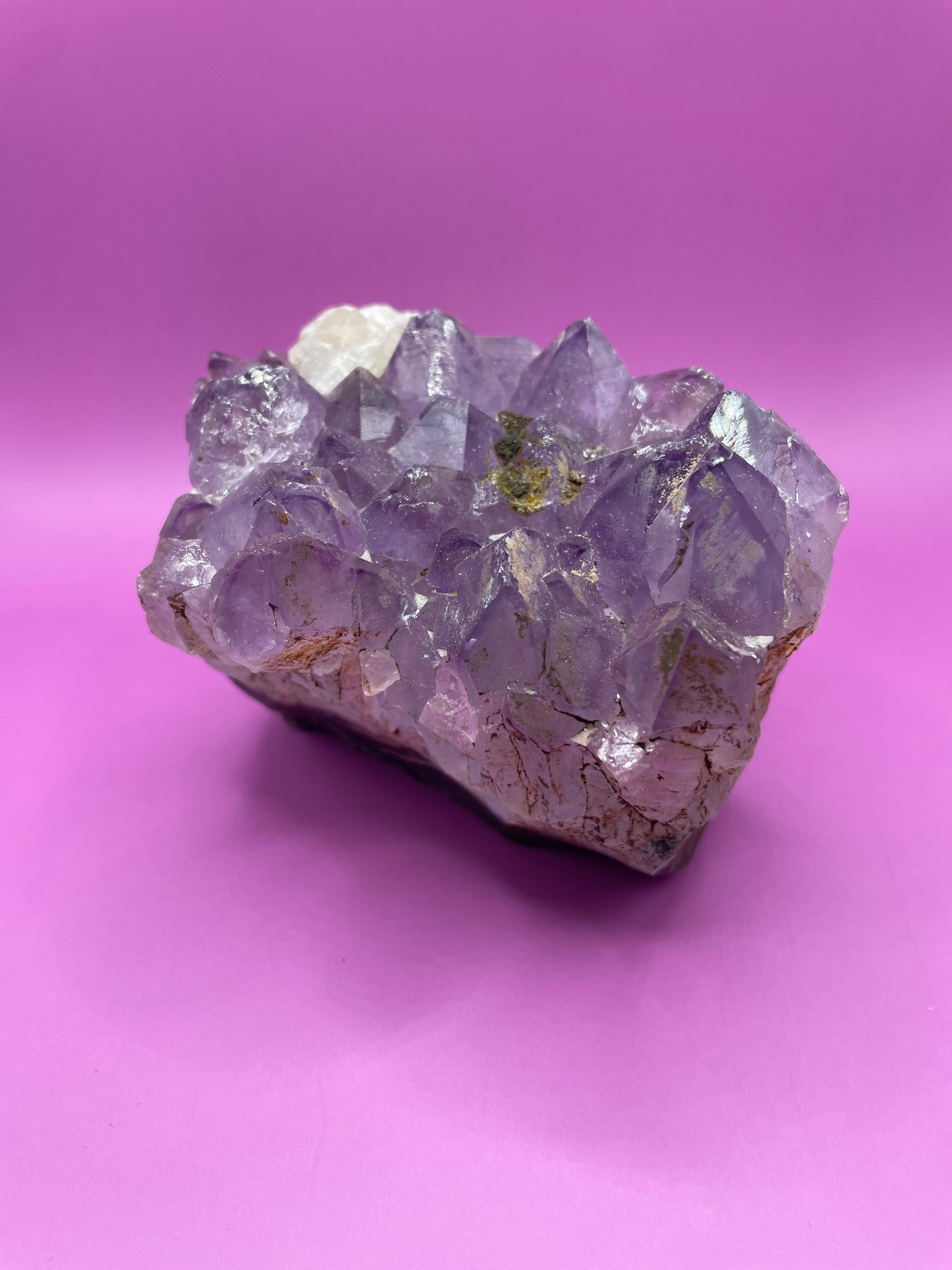 Amethyst is known as the stone of peace, protection, and higher wisdom. Its raw clustered points amplify energy, clear negativity, and create a serene frequency throughout your home, sacred space, or healing practice. This crystal connects deeply with the Third Eye and Crown chakras, opening the door to divine intuition, dreamwork, and emotional release.