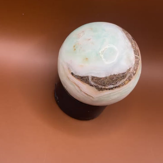 This Caribbean Calcite Sphere brings ocean-calm to the mind, inviting deeper breaths, gentle focus, and an easy, creative flow. Its energy softens the heart without floating off - so you feel lighter yet still grounded. Because it’s a natural pairing of blue Calcite (tranquility) and Aragonite (stability), the effect is balanced, steady, and soothing. Visually, each piece is a tiny shoreline: sea-blue bands, sandy layers, and occasional druzy pockets, making every sphere genuinely one-of-a-kind.