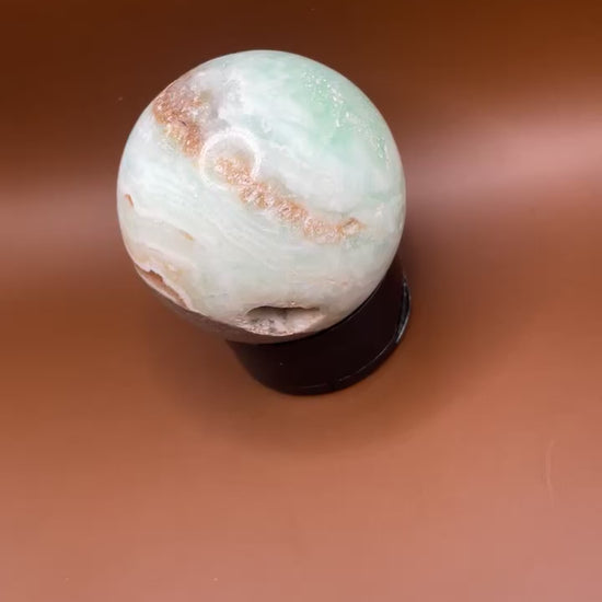 Carry the shoreline into your sacred space. Each hand-polished Caribbean Calcite Sphere reveals dreamy bands of sky-blue Calcite flowing through sandy Aragonite, sometimes with tiny druzy caves that look like foam on the tide. This stone is loved for its soothing, clarifying, and softly uplifting energy - perfect for unwinding the mind, easing emotional tension, and returning to a steady, hopeful rhythm. In a sphere shape, its calm radiates evenly in all directions, making it a beautiful anchor for meditation corners, desks, and altars.