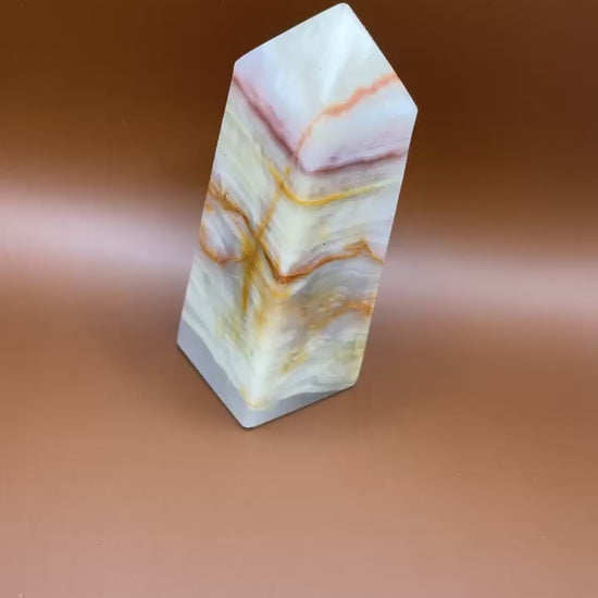Let your space exhale. Hand-polished Pink Banded Onyx Towers channel steady, grounded energy through a focused point, making them beautiful anchors for meditation corners, desks, and altars. The natural bands of blush, rose, and cream create a soothing visual rhythm that helps quiet overthinking, soften self-talk, and support clear, compassionate boundaries. Energetically, this stone bridges Root and Heart - so you feel safe in your body while staying open and kind.